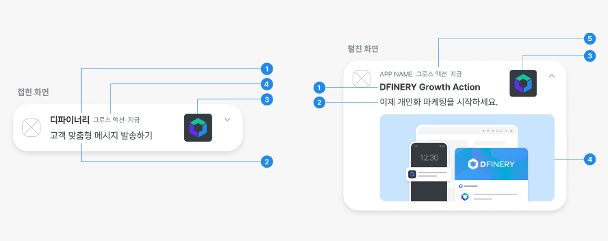 알림 디자인은 시스템 템플릿에 의해 결정되며 알림 규격은 특정 디바이스에 따라 달라질 수 있음.