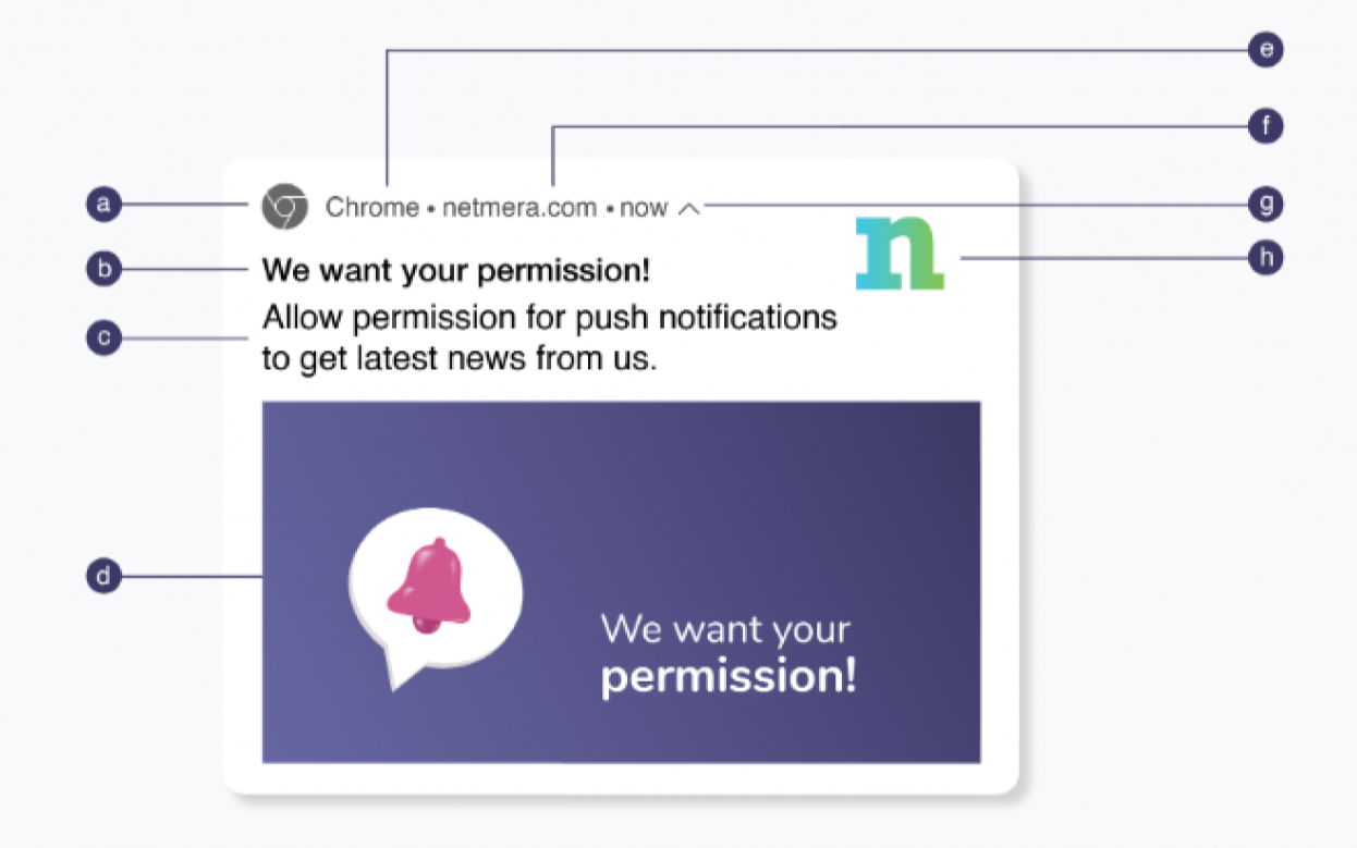 데스크탑 브라우저, 모바일 홈 화면, 모바일 앱 디바이스 알림 센터에서 팝업으로 표시하는 짧은 메시지